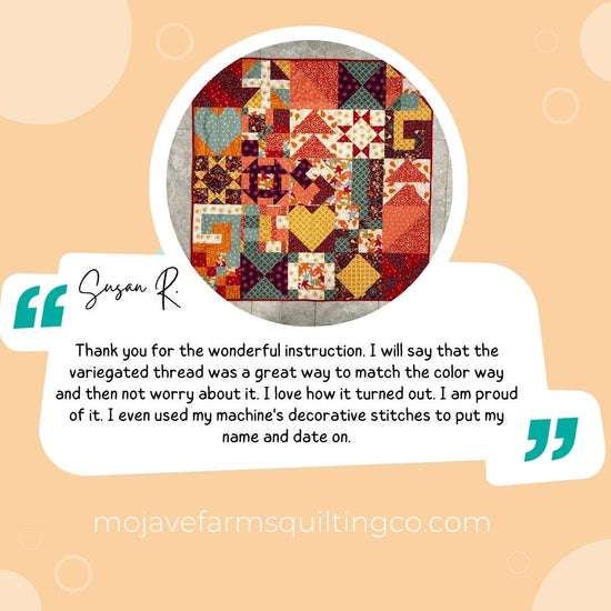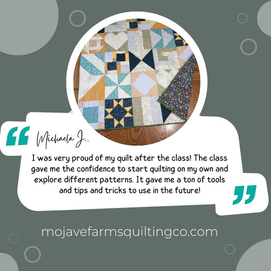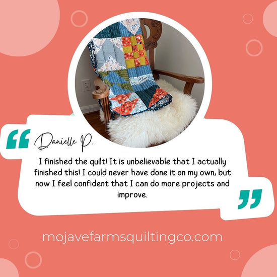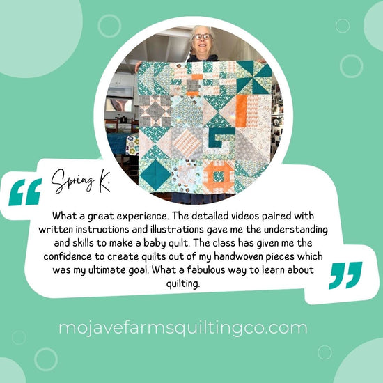 - Lifetime access through your Mojave Farms Quilt Co. account to your course so that you can refer back to the videos and supporting documents whenever you need!