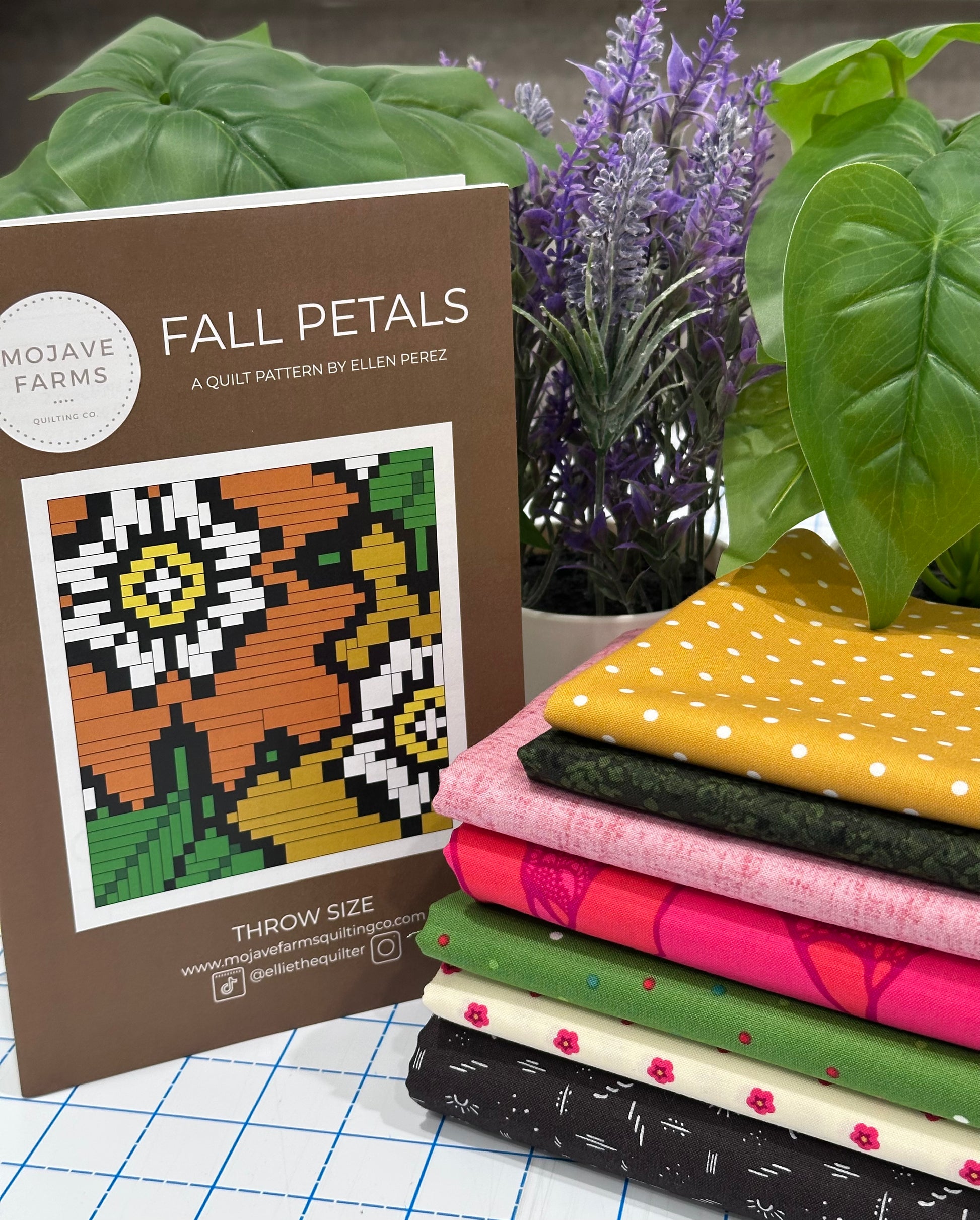 Kit Includes: Fall Petals Quilt Pattern, all fabric needed to assemble the quilt top, including binding. Backing and batting are not included in quilt kits. (Flowers are the red and pink fabrics)