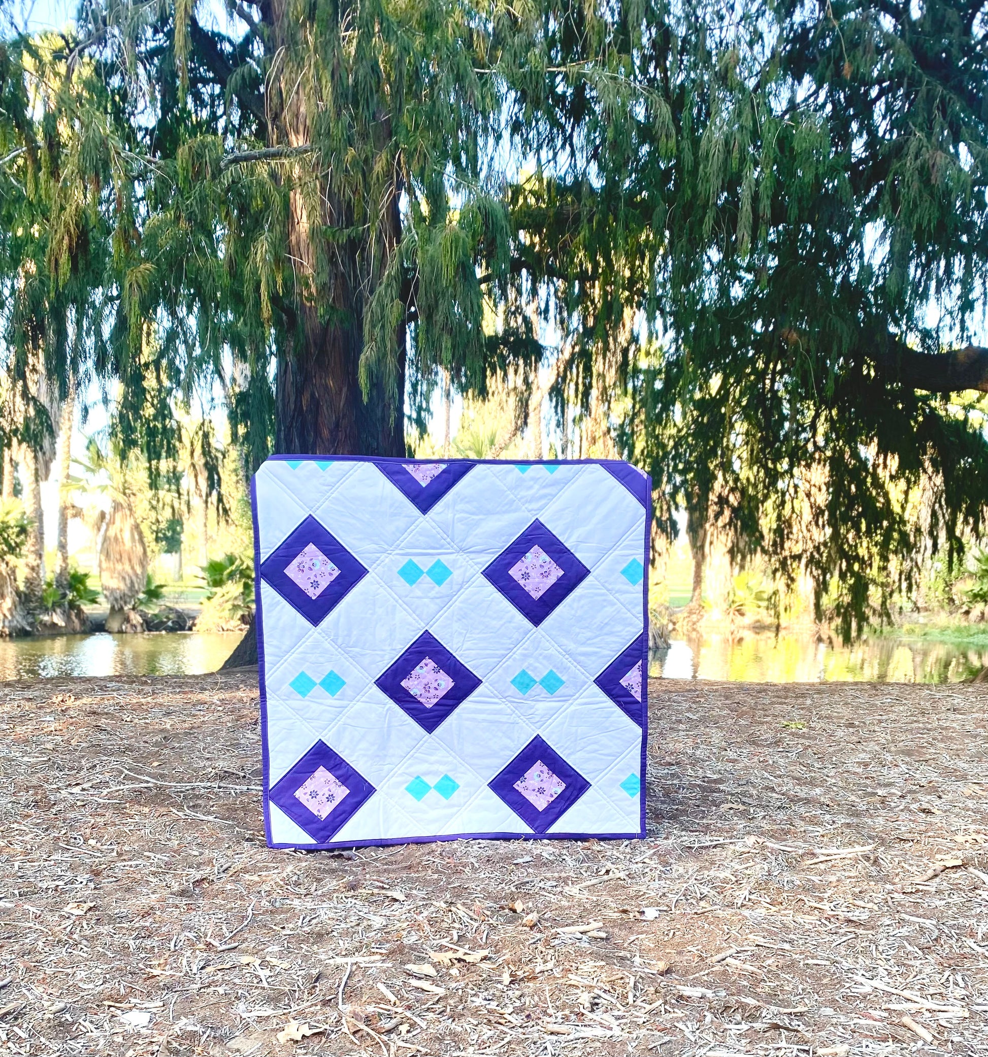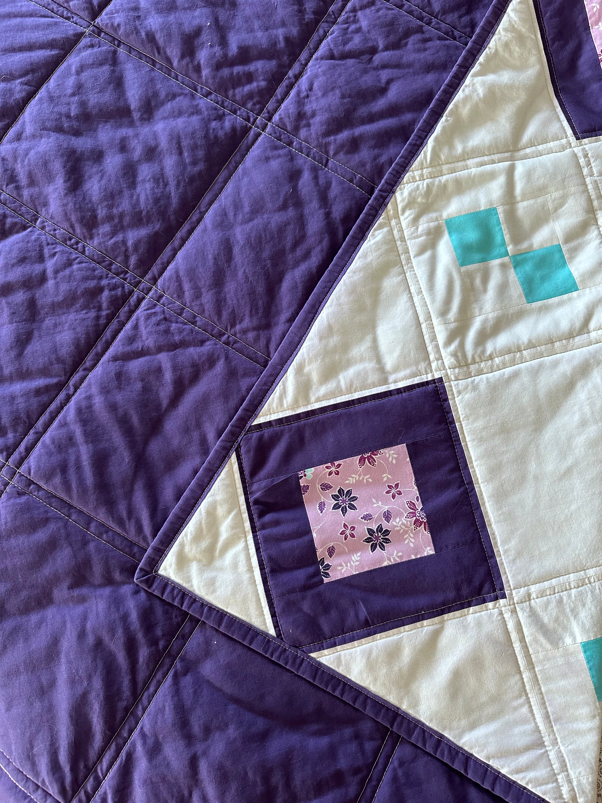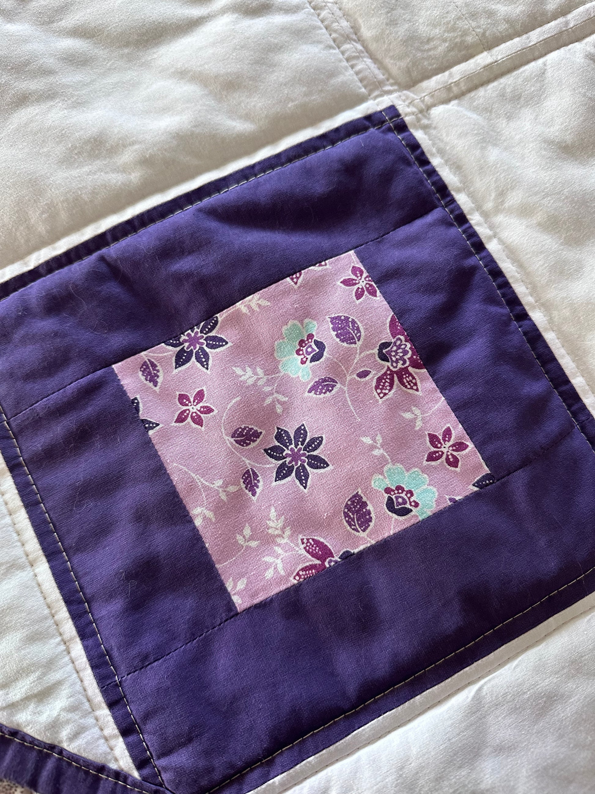 Infant size test quilt (38” x 38”) made with the Mojave Farms Pomegranate pattern with a white, turquoise, and purple color way with small florals. Fabric is 100% quilting cotton, quilted on a domestic sewing machine in straight line style.