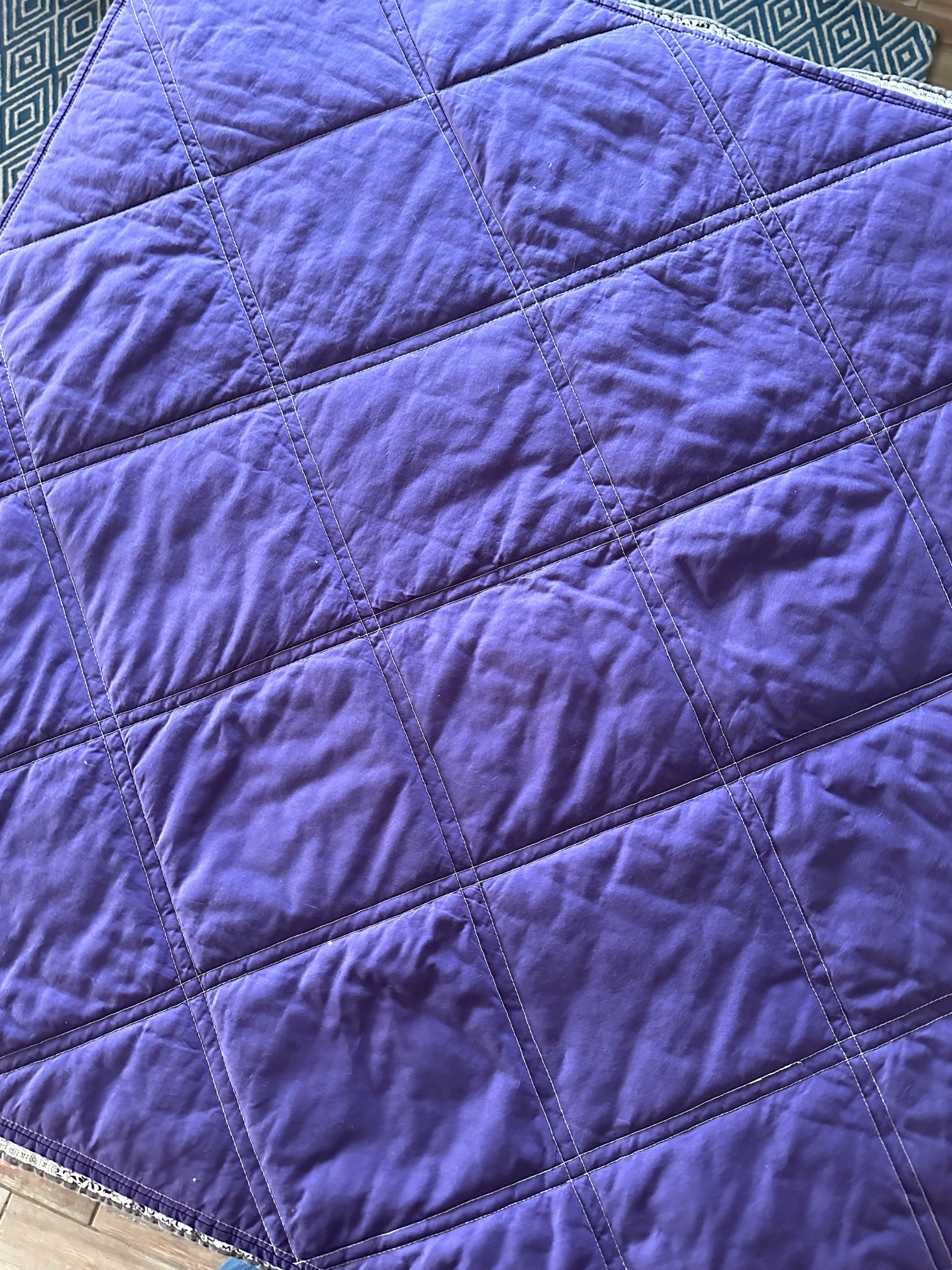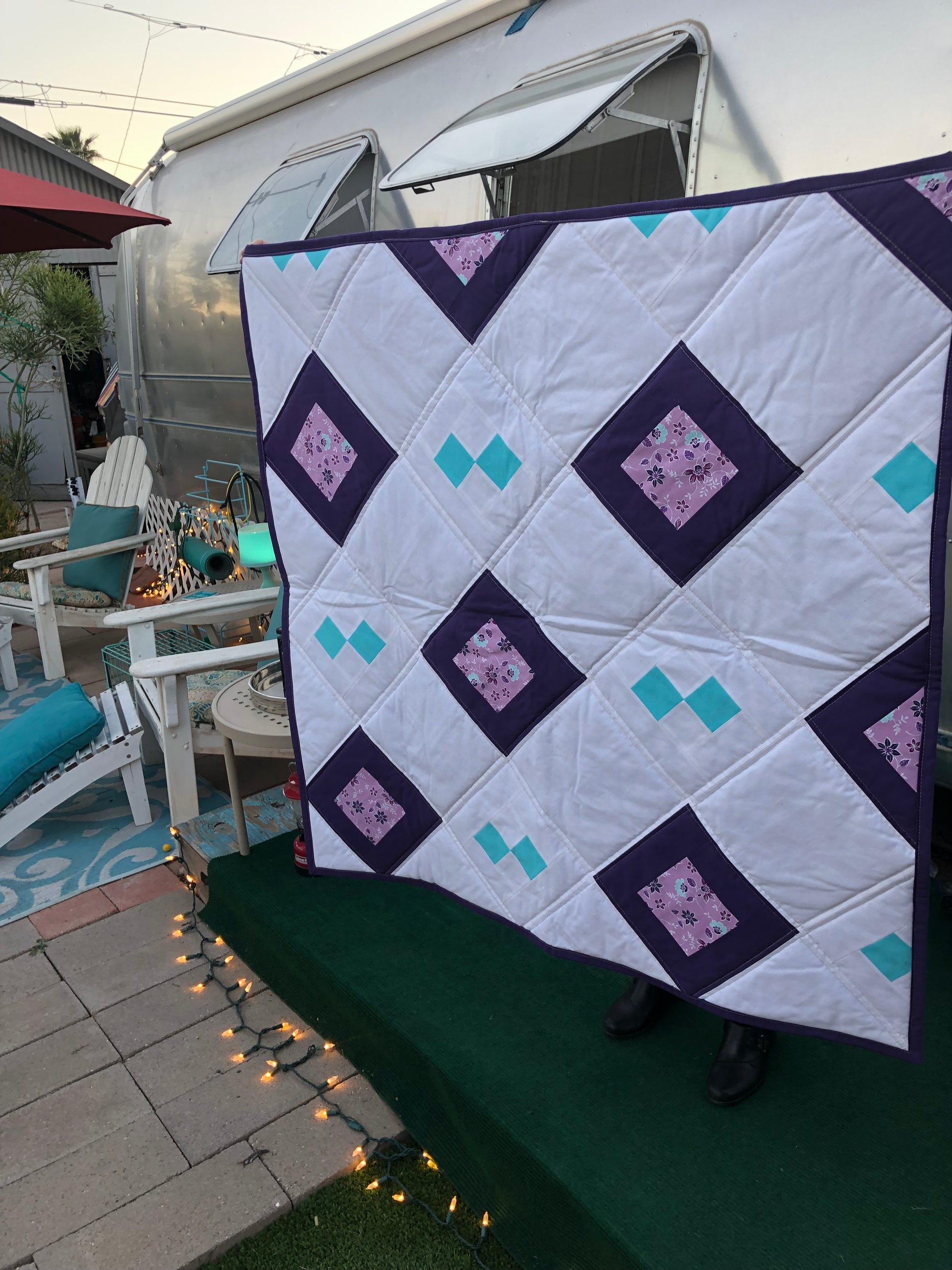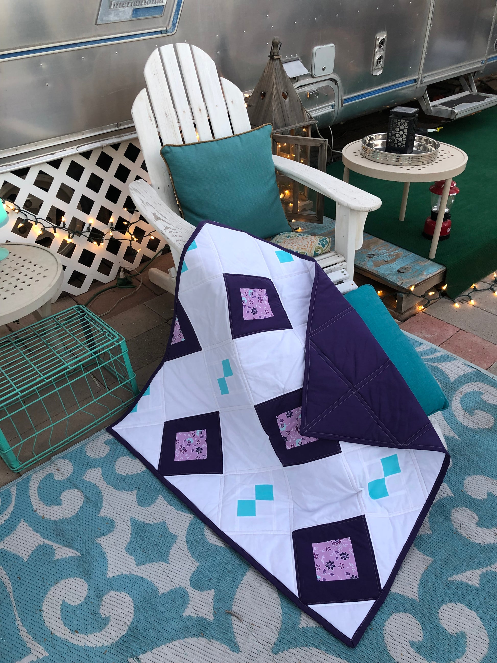 Infant size test quilt (38” x 38”) made with the Mojave Farms Pomegranate pattern with a white, turquoise, and purple color way with small florals. Fabric is 100% quilting cotton, quilted on a domestic sewing machine in straight line style.