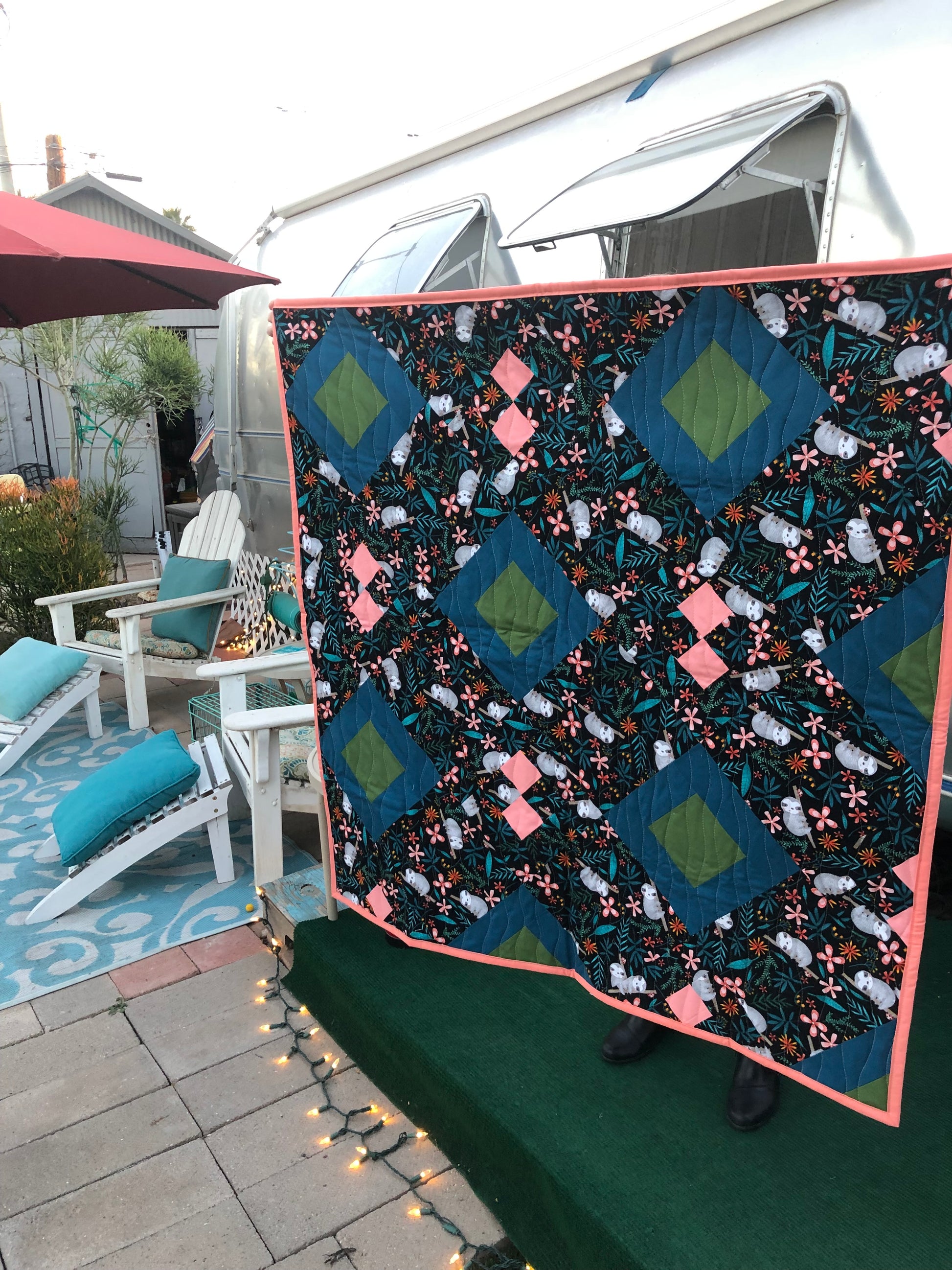 Infant size quilt (38” x 38”) made with the Mojave Farms Pomegranate pattern with a black, olive, blue, and peach color way with adorable sloths and small florals and a gray and white polka dot back. Fabric is 100% cotton flannel and 100% quilting cotton, quilted on a domestic sewing machine in a wavy line style.