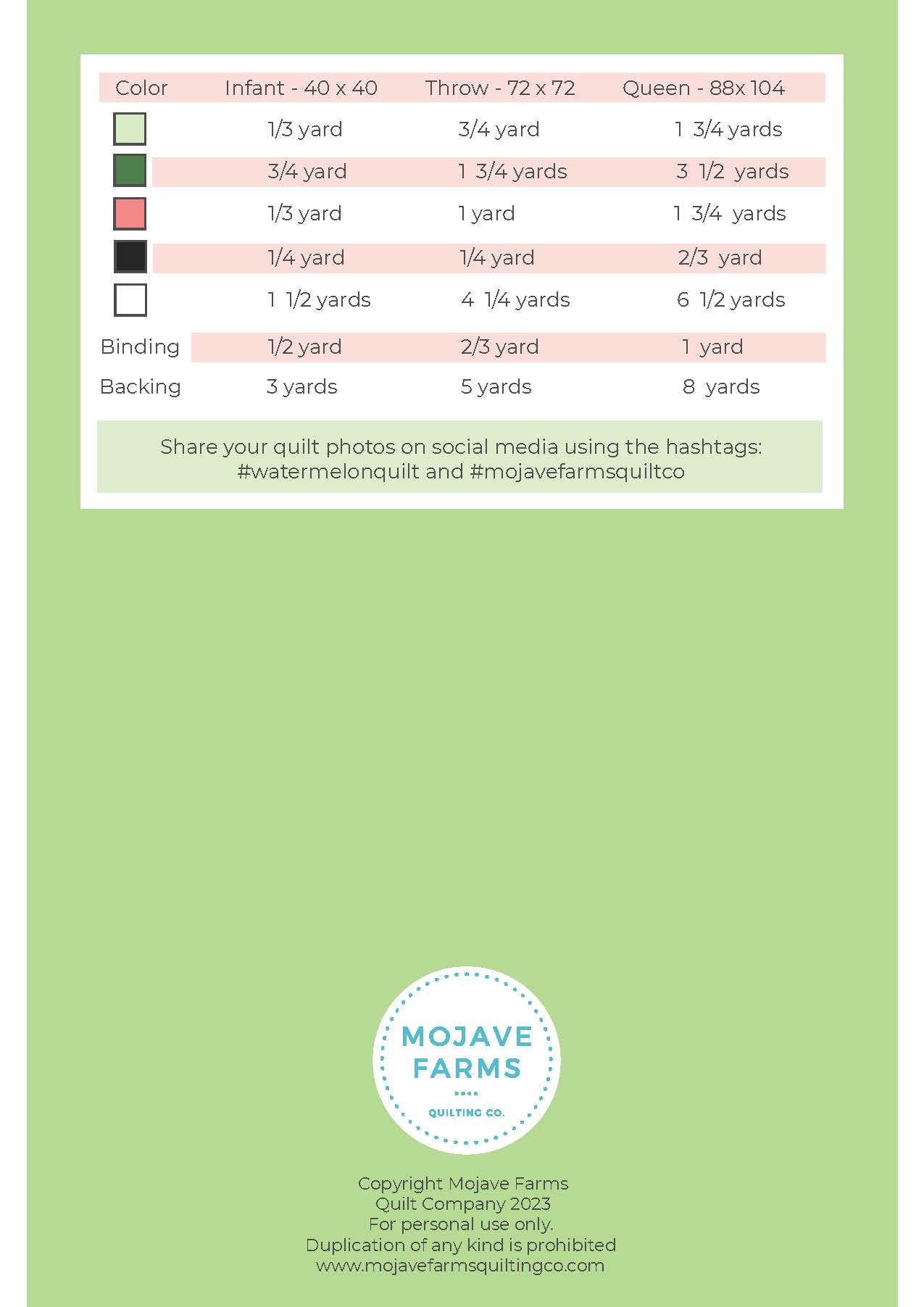 - You may sell quilts that you create using Mojave Farms Quilt Patterns, but please give design credit to Mojave Farms Quilt Company.