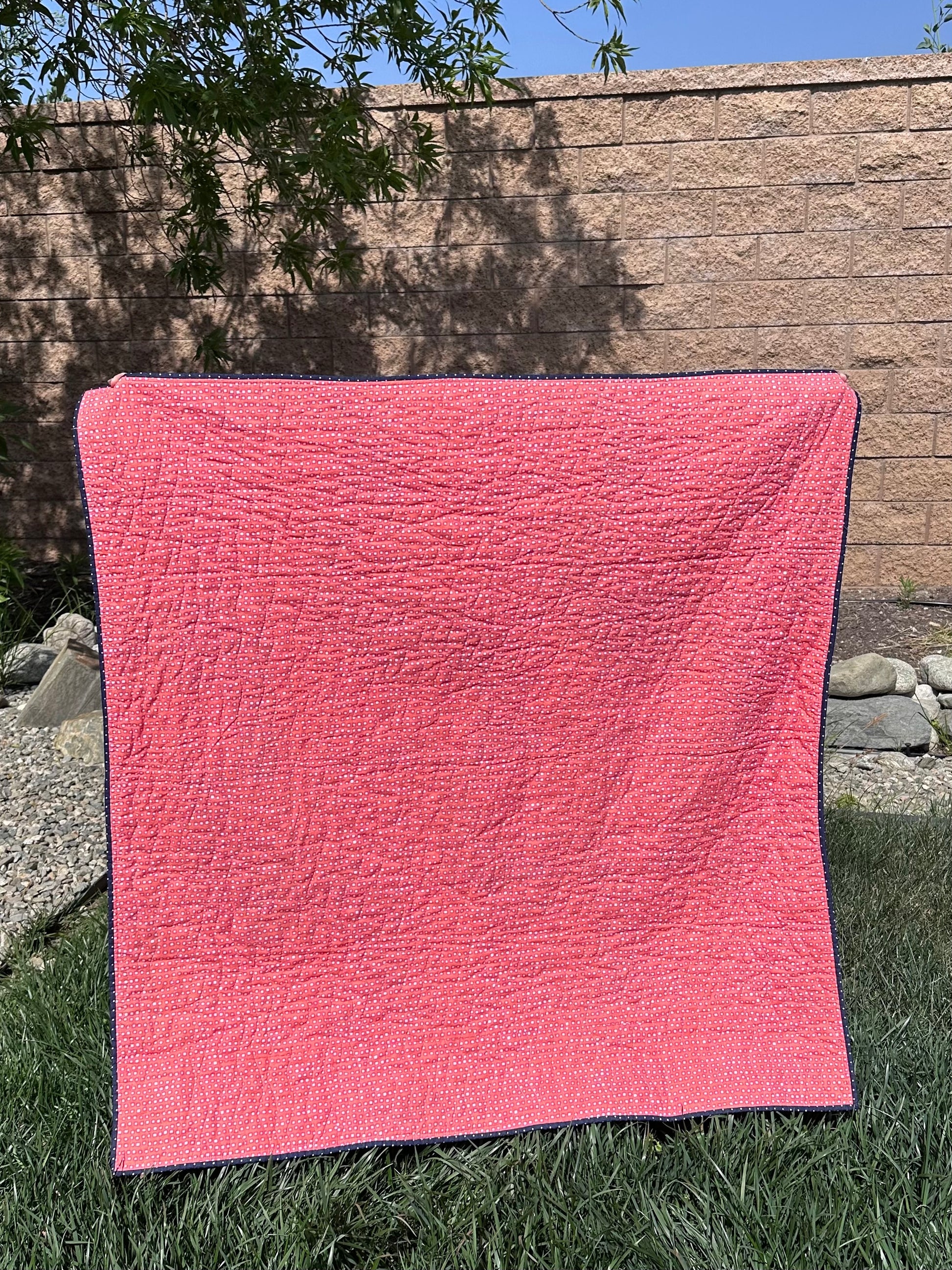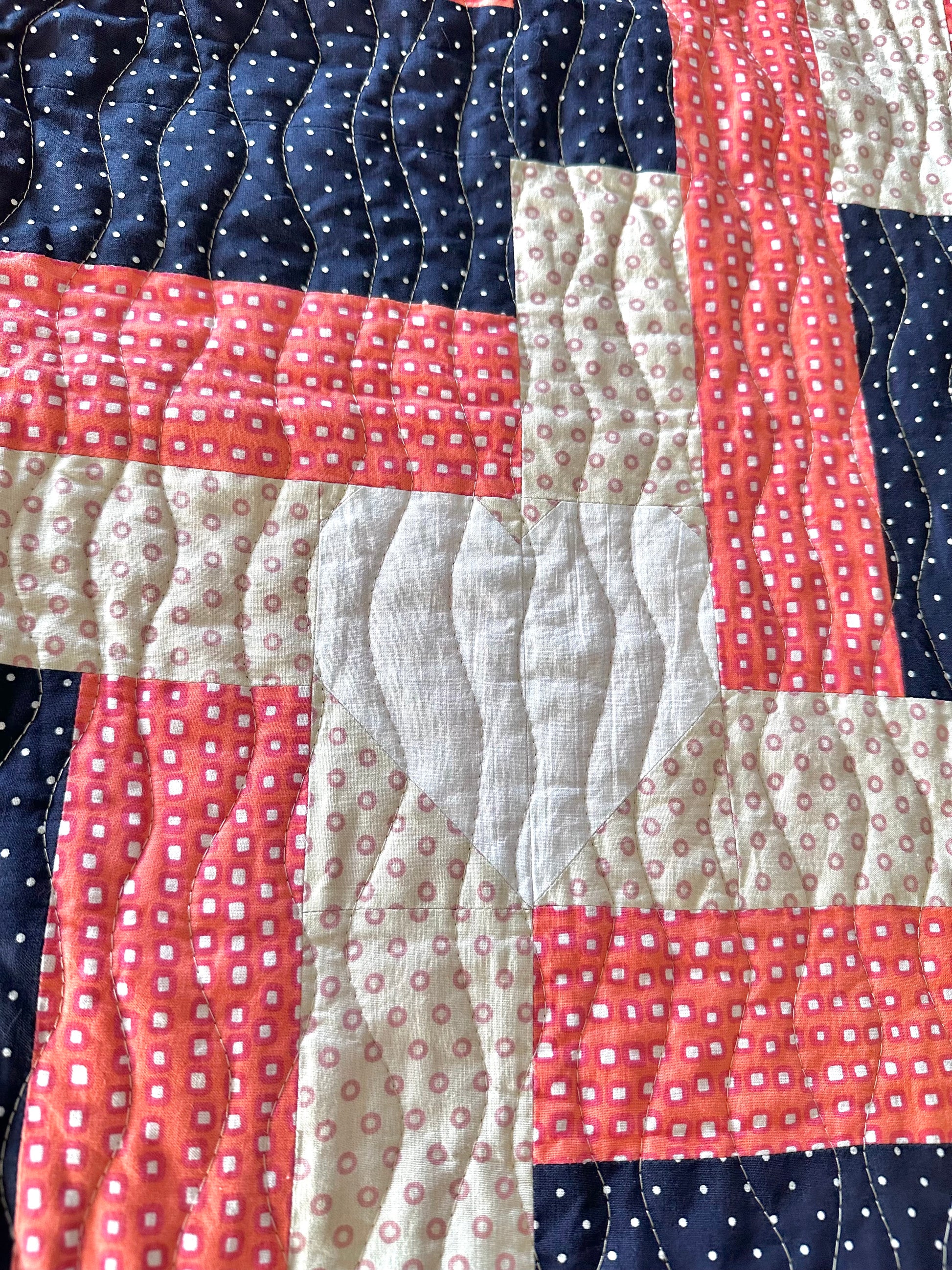 Child size test quilt (45” x 45”) made with the Mojave Farms Windmill Hearts pattern with a white, navy, and coral pink color way with small polka dots. Fabric is 100% quilting cotton, quilted on a domestic sewing machine in a wavy line style.